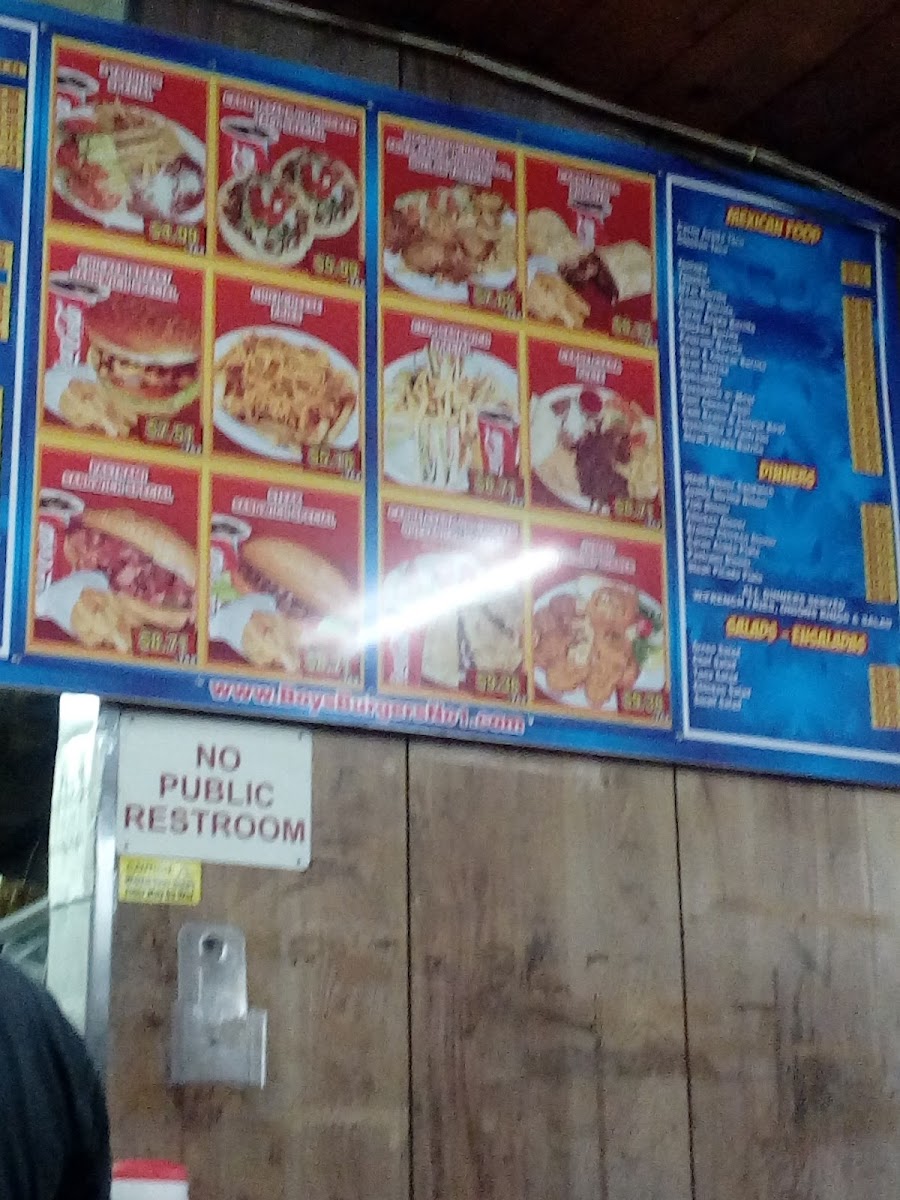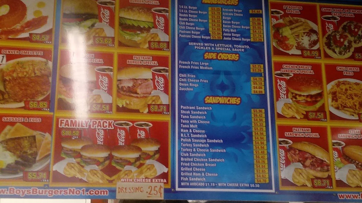 The menu at Boys Burgers offers a variety of options primarily focused on hamburgers and fast food items, suitable for quick meals and casual dining. Visitors can choose from a range of breakfast dishes, burgers, sides, and sandwiches, with selections that cover different times of the day.